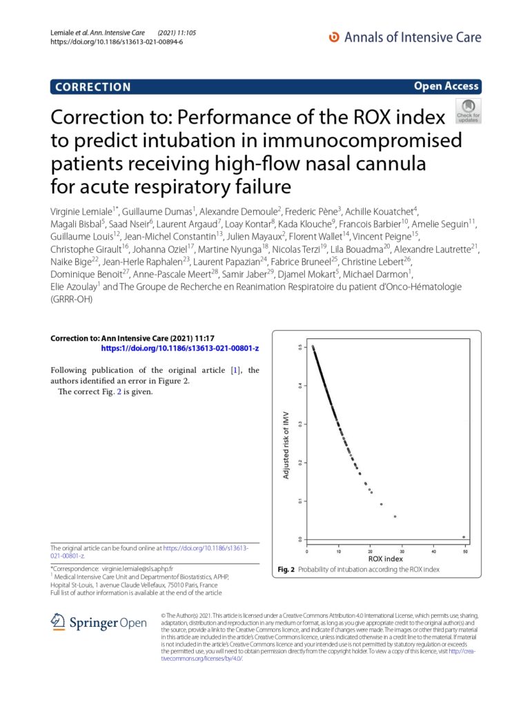 Correction to: Performance of the ROX index to predict intubation in immunocompromised patients receiving high-flow nasal cannula for acute respiratory failure