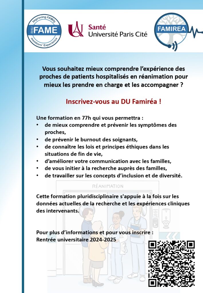 Dans le cadre de notre Recherche Hospitalo-Universitaire (RHU) » FAME » financé par l’Agence Nationale de la Recherche, le groupe FAMIREA ouvre un diplôme Universitaire sur les familles en réanimation pour la rentrée 2024-2025.