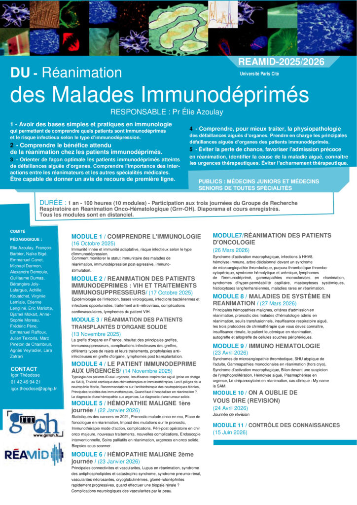 Si vous souhaitez candidater au D.U. REAMID 2025/2026, vous pouvez envoyer votre CV et lettre de motivation adressés au Pr Azoulay par courriel à M. Igor Théodose (igor.theodose@aphp.fr).